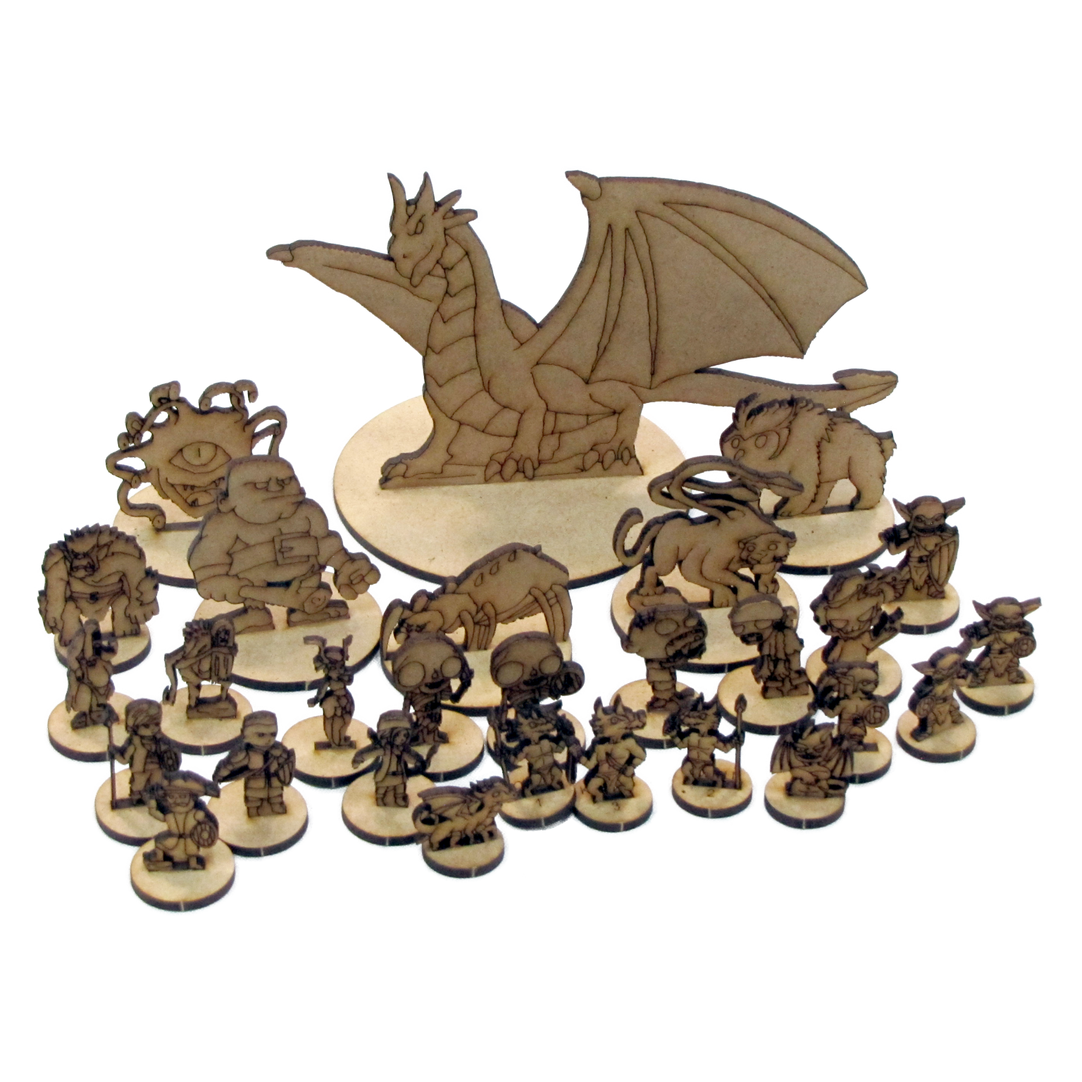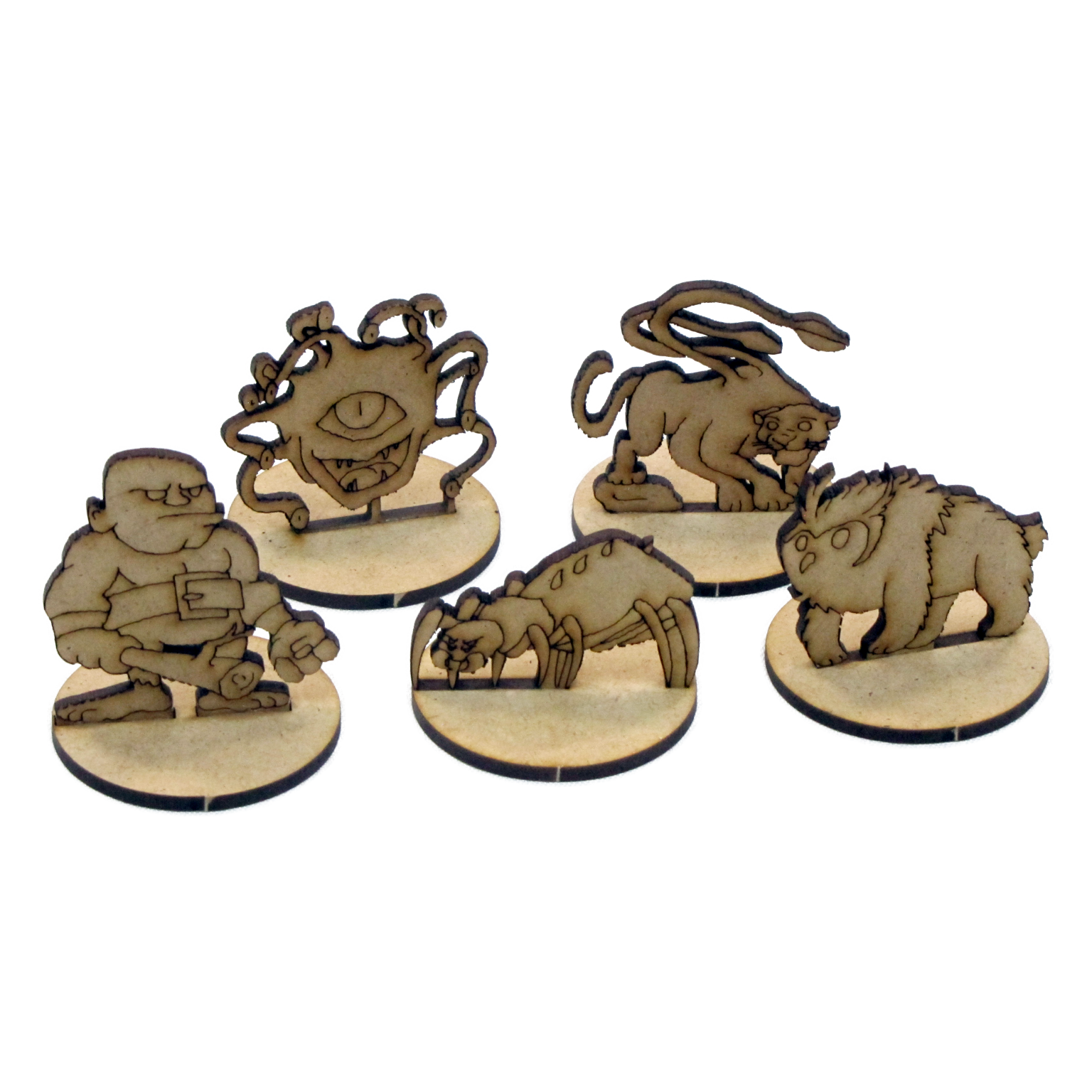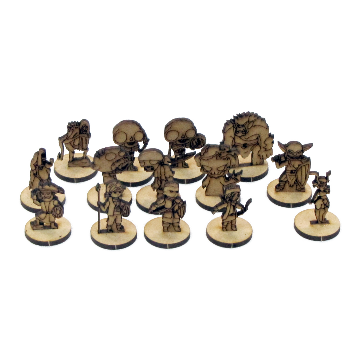 While not exactly 3D miniatures, these are also not just a series of 2D tokens to put down on the table. They are something in between. Our D&D Meeple are cut out of a sheet of MDF, but are able to stand upright giving you the sense of 3D and making it easier to see the miniatures on the table between the buildings and the Dungeon Walls. The groups of miniatures also have their bases numbered to make it easier to identify the different miniatures.