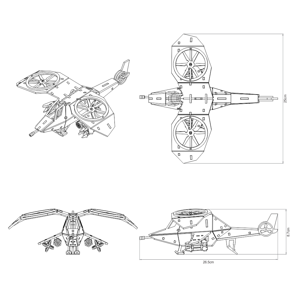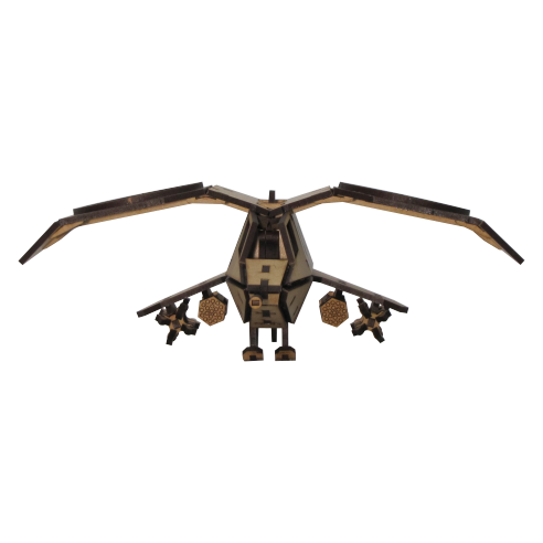 The BGS-v3 offers multiple options in terms of placement and weapons layouts. It has an optional loop at the top allowing it to be hung up, or optional landing gear to stand on its own. The missiles and rockets can be placed in whichever spot you choose.