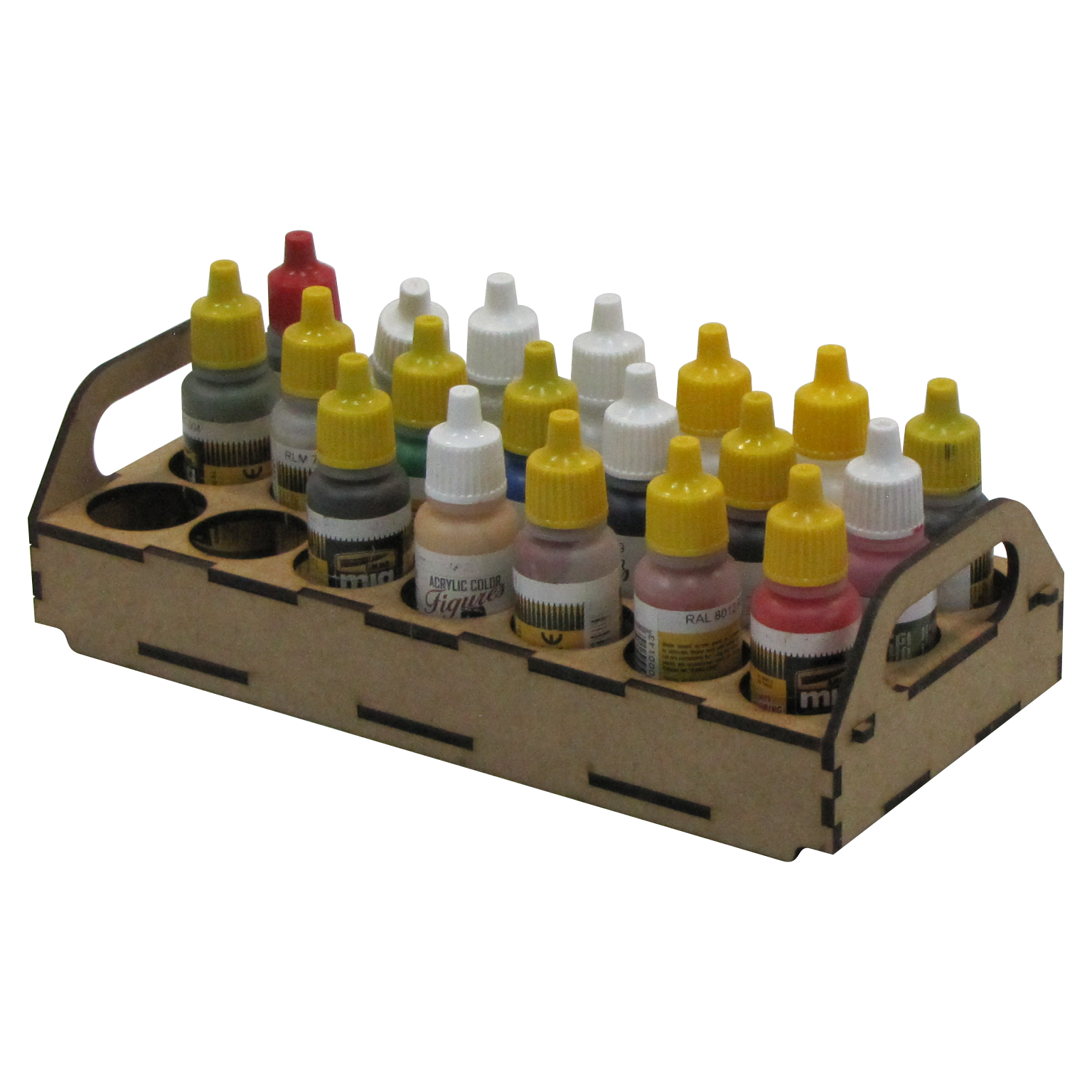 2x Dropper Trays that can take paints such as the Army Painter, MiG Ammo, and Vallejo. It is also large enough to hold the slightly larger bottles some people decant into. Each tray holds 21 paints, giving you 42 spots for paint. Dropper bottles can be stored right side up or upside down.