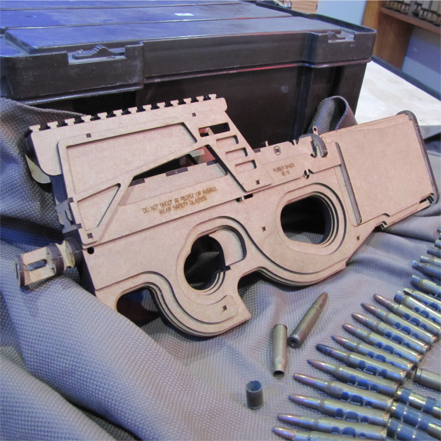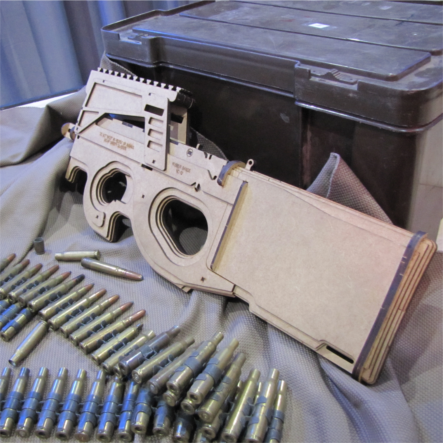 The P90 is a unique and playful twist on the iconic firearm. Our version is meticulously crafted using laser cutting techniques and designed to shoot rubber bands. With its precision and attention to detail, it offers a fun and safe way to engage in imaginative play. And it includes inter-changeable magazines, meaning the doesn't stop after you've shot your first round of rubber bands. Perfect for both kids and enthusiasts alike.