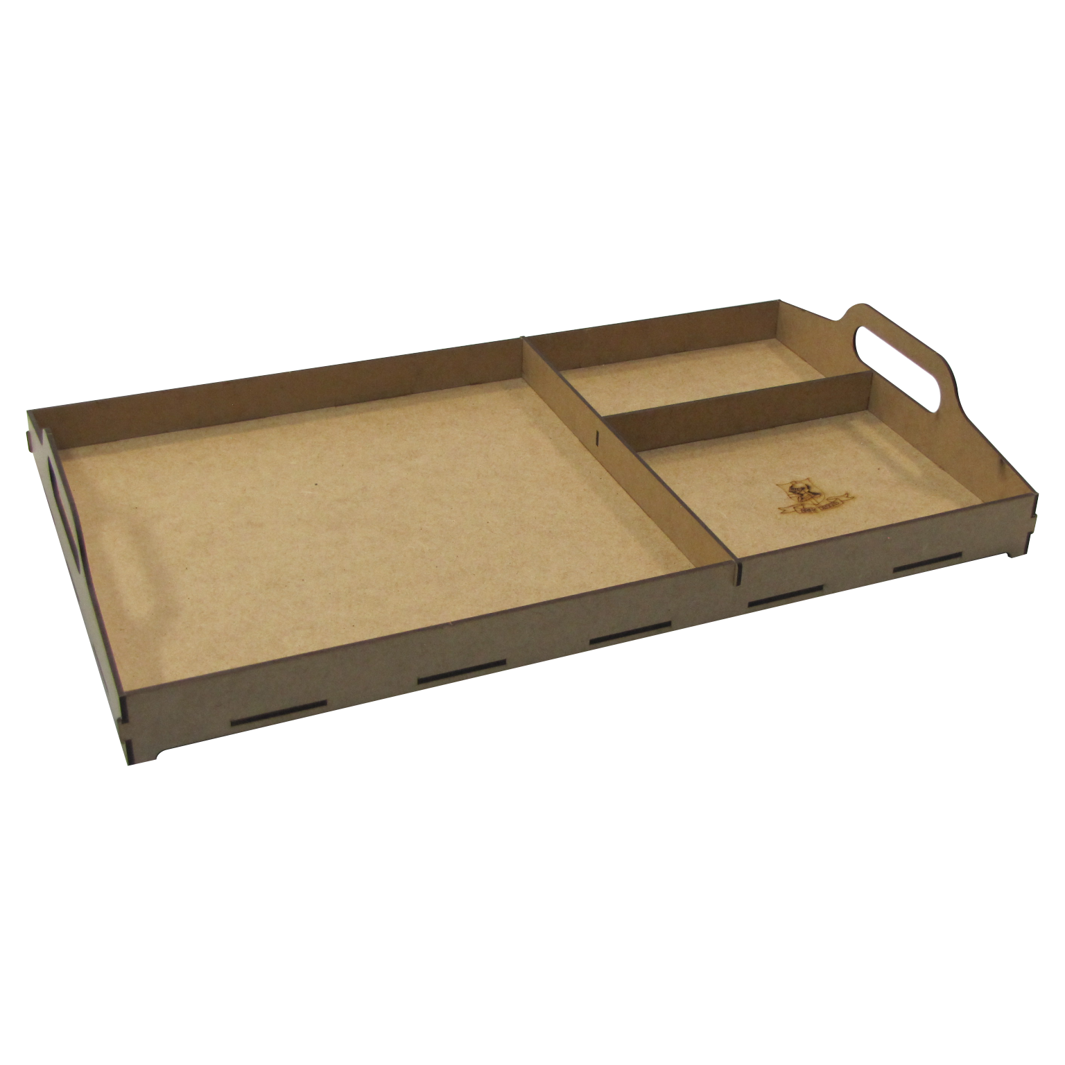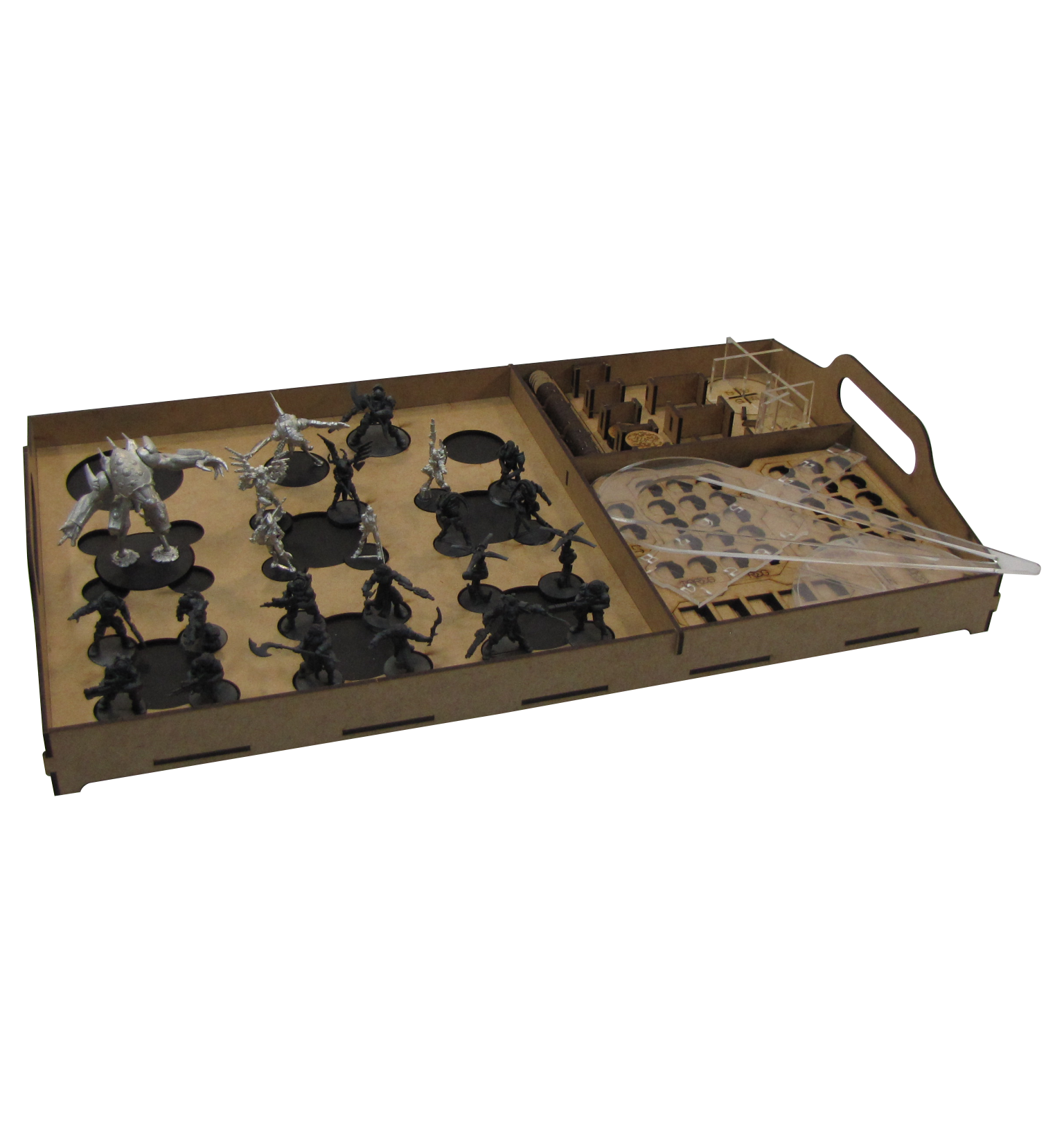 So we've taken the different solutions that we've found to work the best and combined them with some other useful features and created the Tournament Tray. The largest part is meant for your army and has a series of cut-outs to keep your miniatures from sliding around, with a sheet metal plate to allow for magnetization. The smaller two holders contain different inserts designed specifically for the system that you're playing, or they can be removed to make space for more miniatures or other accessories.